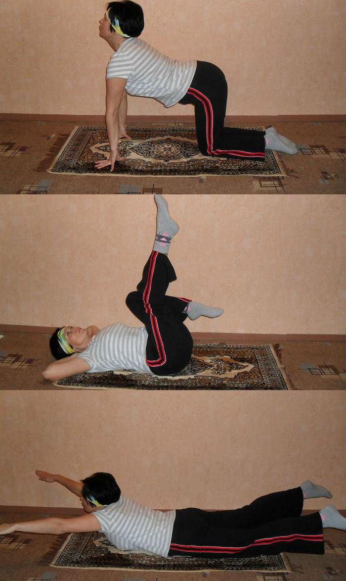 - «Лодочка». Упражнение похоже на предыдущее, но приподнимаете не только верхнюю часть туловища, но и руки, и ноги. Задержитесь в таком положении лежа на животе и опуститесь. Повторите 8-10 раз.
