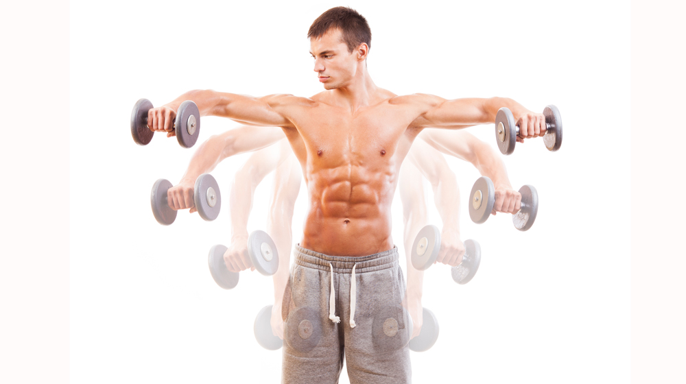 Махи гантелями в стороны стоя, подъемы гантелей через стороны