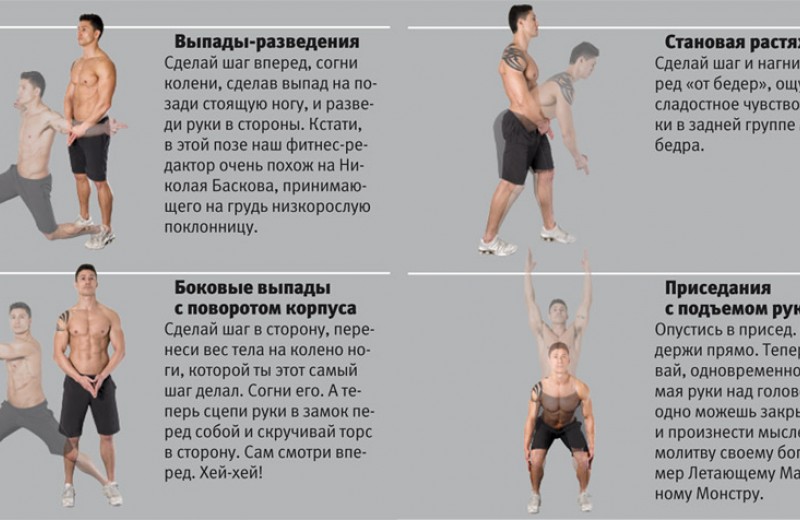 2) Для заминки чередуйте динамические упражнения (приседания, махи руками, выпады, наклоны в стороны, повороты корпуса, наклоны вперёд) со статическими (когда растянутая мышца задерживается в положении на определённое время).